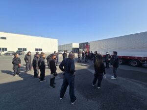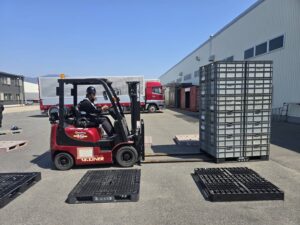 👇フォークリフトを使って、新人社員さんに対してのリフト講習です!